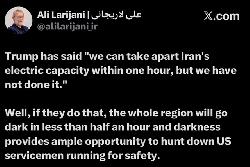 لاريجاني في تغريدة له : ان تم قصف كهرباء ايران فان المنطقة ستتعرض باكملها لانقطاع الكهرباء