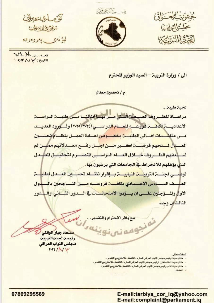 بالوثيقة التربية النيابية تعلن عن رفع كتاب عاجل الى وزارة التربية لأعادة العمل بنظام تحسين المعدل.