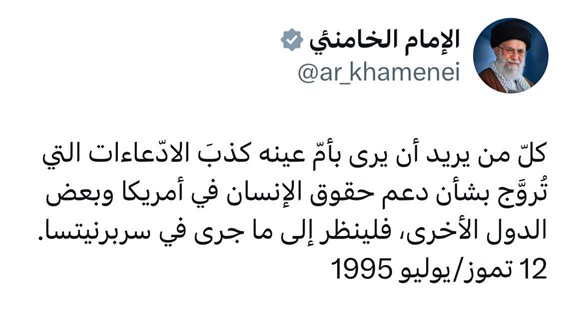 وقال السيد الخامنائي في تدوينة "كل من يريد أن يرى بعينيه كذب الادعاءات بشأن دعم حقوق الإنسان في أمريكا وبعض الدول الأخرى، فلينظر إلى ما جرى في سربرينيتسا".