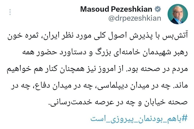 وكتب بزشكيان في تغريدة على منصة "إكس" إن "وقف إطلاق النار، بقبول المبادئ العامة التي ترغب بها إيران، هو ثمرة دماء شهيدنا العظيم خامنئي، وإنجازٌ لتضامن جميع أبناء الشعب".