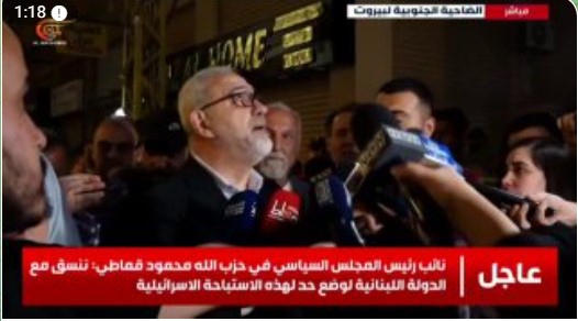 ادان نائب رئيس المكتب السياسي لحزب الله محمود قماطي العدوان الصهيوني الغادر على الضاحية الجنوبية اليوم
