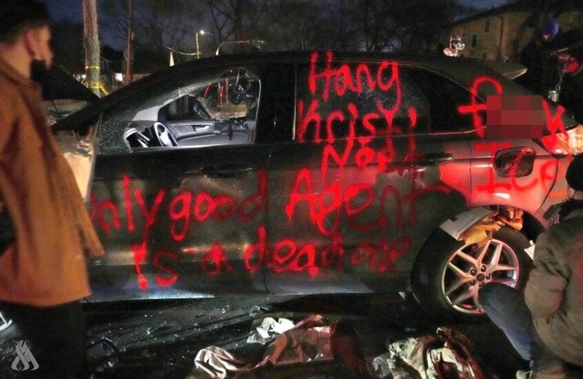 وأظهرت صور نشرت من موقع الحادث إحدى السيارات وقد حُطمت نوافذها بالكامل، مع وجود جسم طويل مغروس في الزجاج الأمامي، في مشهد وصفه مسؤولون فدراليون بـ"الكارثي". وكانت المركبة مغطاة أيضاً برسائل تهديدية كُتبت بطلاء أحمر، من بينها عبارات تدعو إلى شنق وزيرة الأمن الداخلي كريستي نويم، وشعارات معادية لهيئة الهجرة والجمارك، وأخرى تمجد قتل عناصرها.