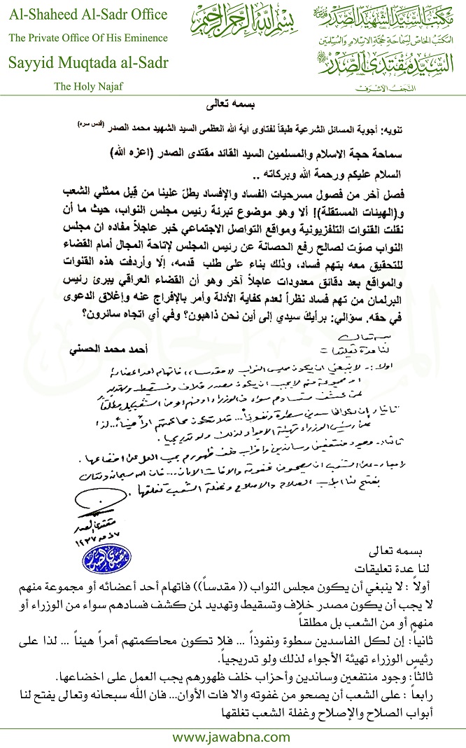 وقال الصدر في تعليقه على سؤال حول إفراج القضاء عن رئيس مجلس النواب سليم الجبوري، في قضية اتهامه بالفساد "لا ينبغي أن يكون مجلس النواب [مقدسا] فاتهام أحد أعضائه أو مجموعة منهم لا يجب ان يكون مصدر خلاف وتسقيط وتهديد لمن كشف فسادهم سواء من الوزراء أو منهم أو من الشعب بل مطلقاً".