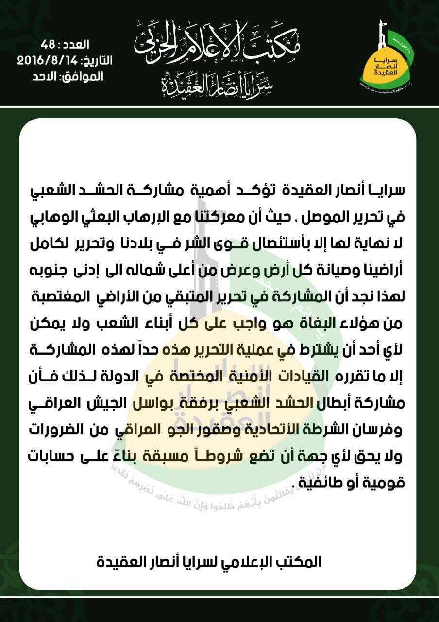 وقال بيان للمكتب لسرايا أنصار العقيدة إحدى ألوية الحشد الشعبي البارزة ، وتلقته وكالة انباء براثا ،أن معركتنا مع الإرهاب البعثي الوهابي لا نهاية لها إلا بأستئصال قوى الشر في بلادنا وتحرير لكامل أراضينا وصيانة كل أرض وعرض من أعلى شماله الى إدنى جنوبه لهذا نجد أن المشاركة في تحرير المتبقي من الأراضي المغتصبة من هؤلاء البغاة هو واجب على كل أبناء الشعب ولا يمكن لأي أحد أن يشترط في عملية التحرير هذه حداً لهذه المشاركة إلا ما تقرره القيادات الأمنية المختصة في الدولة لذلك فأن مشاركة أبطال الحشد الشعبي برفقة بواسل الجيش العراقي وفرسان الشرطة الأتحادية وصقور الجو العراقي من الضرورات ولا يحق لأي جهة أن تضع شروطاً مسبقة بناءً على حسابات قومية أو طائفية .