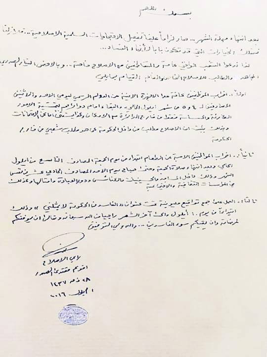 ودعا الصدر الى "إضراب الموظفين كافة، عدا الاجهزة الامنية، عن الدوام الرسمي ليومي الاحد والاثنين المصادفين 4 و5 أيلول والبقاء امام دوائرهم لتمشية الامور الطارئة والحساسة فقط من خارج الدائرة مع الامكان، وكذا يستثنى أماكن الامتحانات، وبذلك يثبت ان الاصلاح مطلب داخل الحكومة كما هو مطلب شعبي من خارج الحكومة".