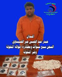 وذكر بيان لشرطة محافظة ذي قار ان "محكمة جنايات ذي قار قضت بالحكم على المدان [حيدر عبد الحسين جبر علاوي الحسيناوي ] بالسجن لمدة سبع سنوات ومصادرة امواله المنقولة وغير المنقولة وفق احكام المادة ١٤ من قانون مكافحة المخدرات رقم 68 لسنة 1965 المعدل وتسجيلها باسم وزاره المالية وذلك عن جريمته حيازته الحبوب المخدرة بقصد المتاجرة بها ومصادرة الحبوب المضبوطة المتكونة من 11 كيسا وكل كيس يحتوي على الف حبة ذات لون تبني وارسالها الى دائرة الطب العدلي في بغداد لغرض اتلافها .