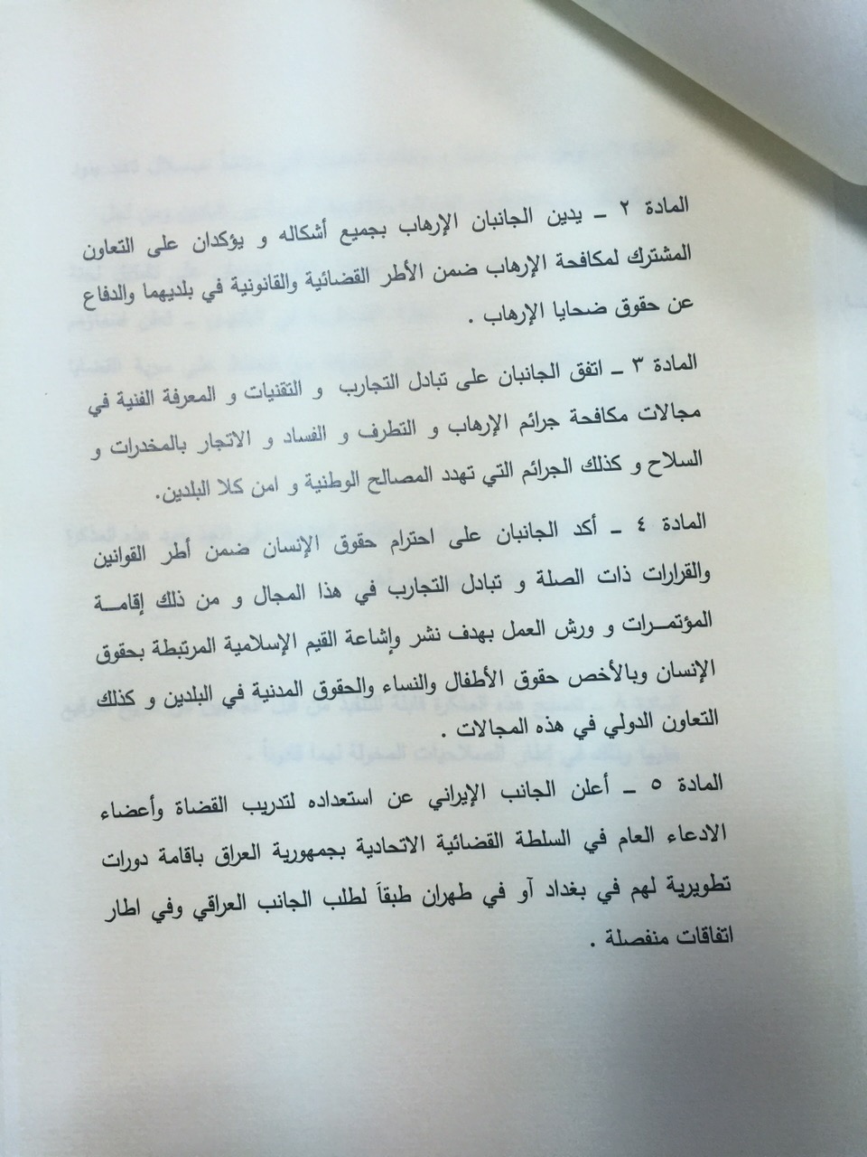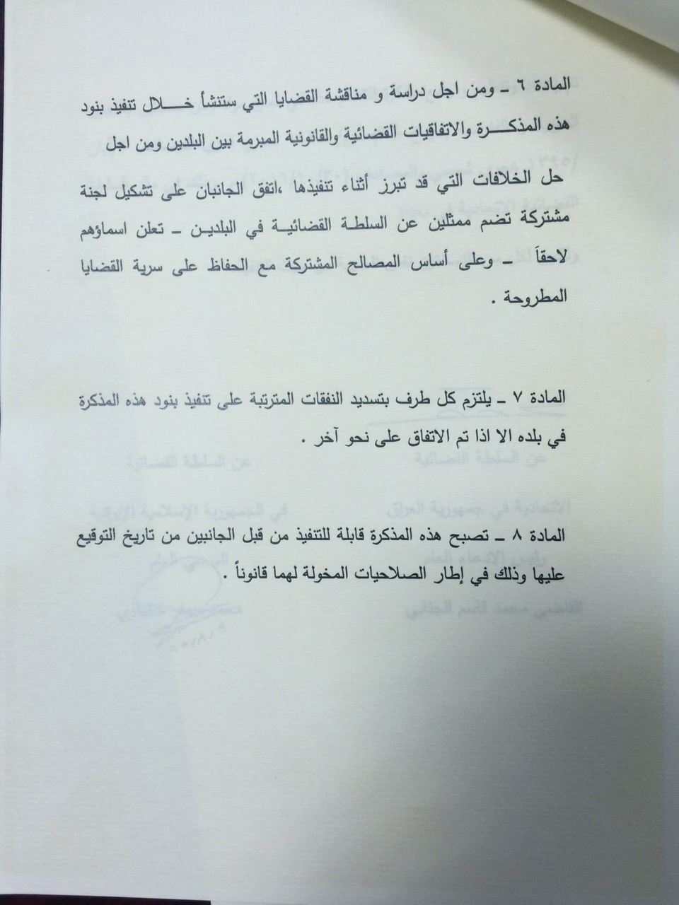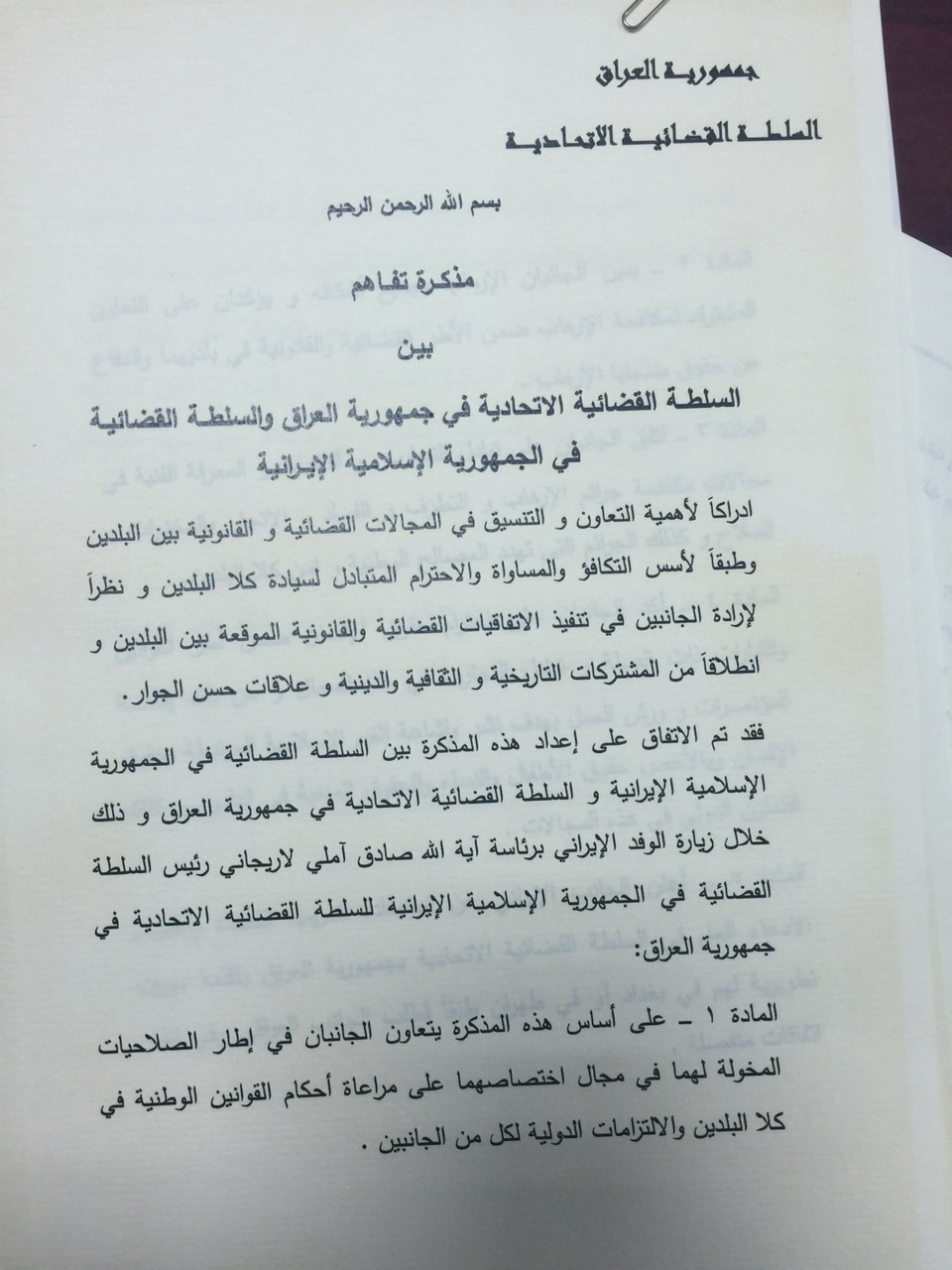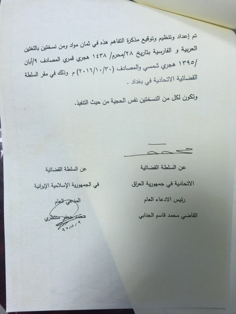 وقال القاضي المحمود في مؤتمر صحفي مشترك على هامش الاجتماع المنعقد في مقر السلطة القضائية الاتحادية ببغداد وحضره كبار المسؤولين القضائيين للبلدين، أن "المذكرة تخص ملفات قضائية تهم الجانبين العراقي والإيراني وهي امتداد لاتفاقيات سبق أن تم توقيعها في العام 2012".