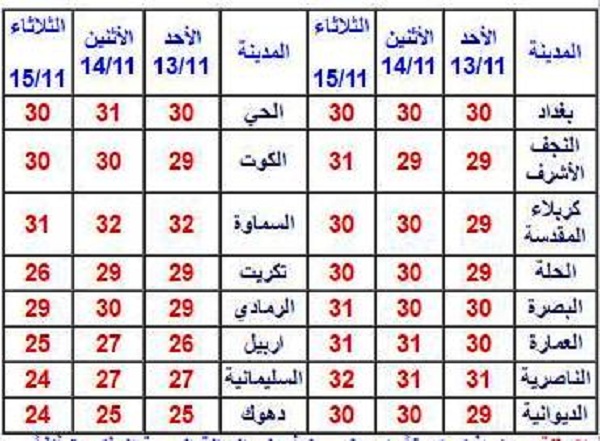 من المتوقع أن يكون الطقس يوم 13/11/2016 بين صحو وغائم جزئياً وتتكاثر الغيوم يومي 14و15/11/2016 ليتحول الطقس الى غائم، ودرجات الحرارة العظمى المتوقعة في بعض محافظات العراق للايام 13و14و2016/11/15 هي بين 26 – 31 درجة في وسط وجنوب العراق بمشيئته تعالى وبحسب الجدول أدنا الذي اصدرته الهيئة العامة للأنواء الجوية والرصد الزلزالي العراقية.