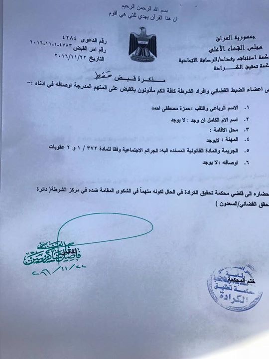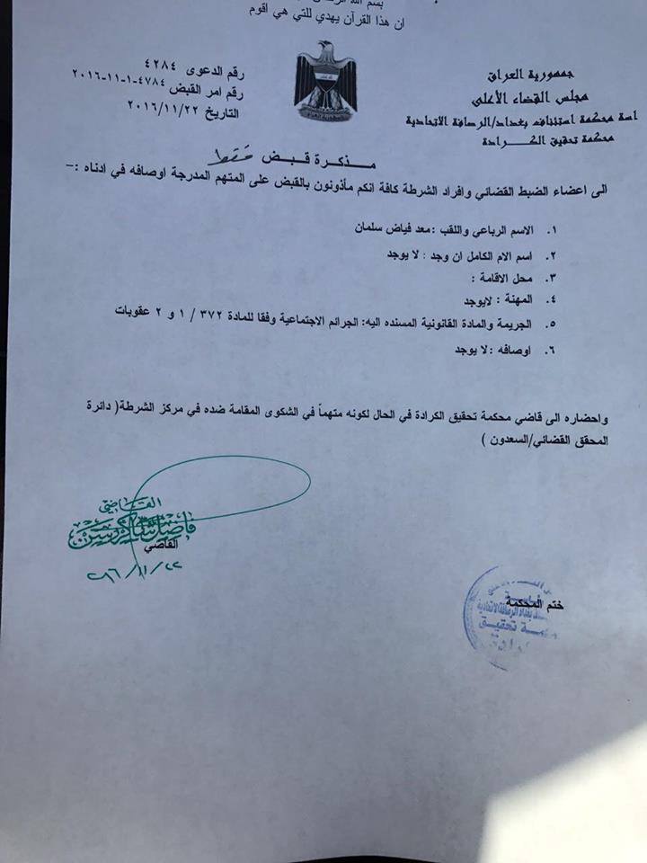 اصدرت محكمة تحقيق الكرادة اليوم الثلاثاء اوامر اعتقال كل من مدير صحيفة الشرق الاوسط في بغداد معد فياض ومراسل الصحيفة حمزة مصطفى بتهمة الجرائم الاجتماعية وفقا للمادة 372/ 1 و2 عقوبات ، كونهما متهمان في الشكوى المقامة ضده في مركز الشرطة دائرة تحقيق القضائي / السعدون.