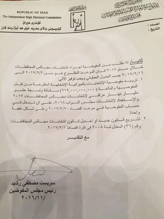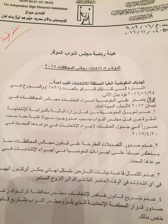 أعلنت المفوضية العليا المستقلة للانتخابات في العراق، اليوم الاثنين، عن عدم امكانية إجراء انتخابات مجالس المحافظات المحلية خلال شهر نيسان 2017، وفيما عزت الأسباب الى نقاط عدة ابرزها عدم وجود التمويل والسيولة النقدية وعدم صدور التعديلات المقترحة أو اكتمال قاعدة بيانات النازحين بشكل نهائي، اقترحت اجراءها خلال شهر أيلول المقبل.
