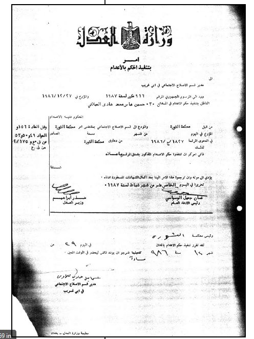 وأضاف الحكيم، ان "الشاوي وقع فيها على إعدام الشهداء بتوقيعه، وفعلا فقد نفذت أحكام الإعدام بأولئك الضحايا، وكمثال على ذلك [من آلاف الامثلة] فقد وقع في الوثيقة المرفقة، على إعدام الشهيد السيد حسين عباي محمد هادي الميلاني، أخ الشهيد السيد حسن عباس محمد هادي الميلاني، الذي أمر المجرم صدام التكريتي بإعدامه في المرسوم الجمهوري 916 مكرر، لسنة 1987 ، والمؤرخ في 27-12-1986، و وقع على ذلك المجرم غسان جميل الوسواسي رئيس الإدعاء العام، و المجرم إسماعيل حمادي علاوي مدير قسم الإصلاح الإجتماعي في سجن أبو غريب السيء الصيت ، مع إعدام [102]، شهيداً آخر".