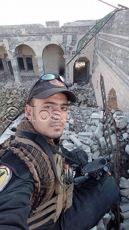 وتظهر الصورة أحد عناصر جهاز مكافحة الارهاب وهو يلتقط صورة "سيلفي" على حطام جامع المرقد اليوم الاثنين (16 كانون الثاني 2017).