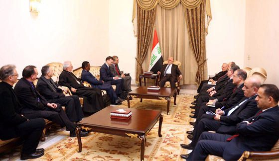 وقال المكتب الاعلامي لرئيس الوزراء حيدر العبادي، في بيان صحفي إن الاخير "استقبل وفدا من مجلس الكنائس العالمي برئاسة الأمين العام اولاف فايكسة تفيت، وجرى خلال اللقاء مباركة الانتصارات المتحققة في العراق على الارهاب والحفاظ على الاقليات والوضع في المنطقة"