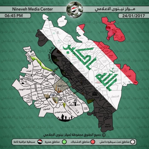 أعلنت قيادة عمليات قادمون يانينوى تحرير الساحل الأيسر من مدينة الموصل بالكامل من عصابات داعش الارهابية.