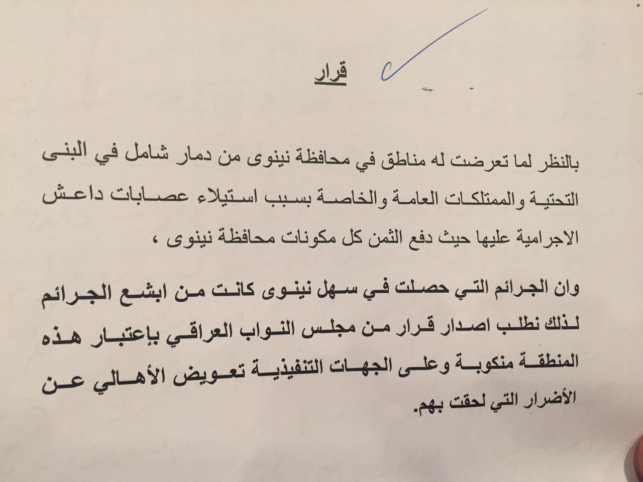 وجاء في نص القرار اليوم بالنظر لما تعرضت له مناطق في محافظة نينوى من دمار شامل في البنى التحتية والممتلكات العامة والخاصة بسبب استيلاء عصابات داعش الارهابية عليها حيث دفع الثمن كل مكونات محافظة نينوى .