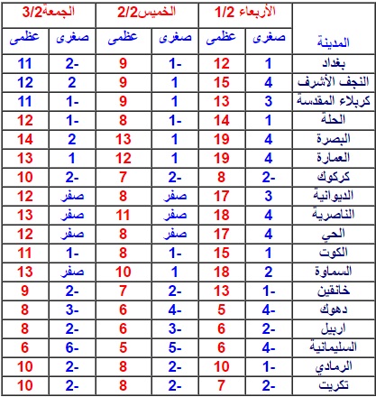 وأصدرت الأنواء الجوية جدولاً بدرجات الحرارة الصغرى والعظمى المتوقعة في بعض محافظات العراق للأيام الثلاثة المقبلة [1و2و3 شباط] وهي كالآتي: