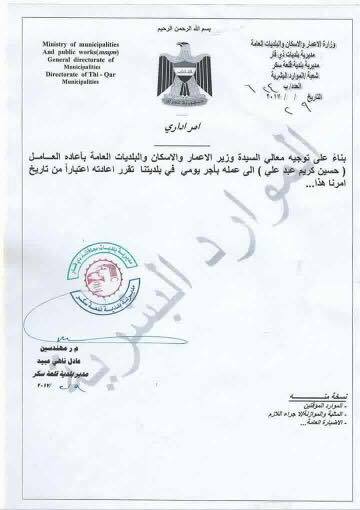 وجهت وزيرة الاعمار والاسكان والبلديات العامة باعادة العامل (حسين كريم عبد علي) الى عمله باجر يومي في بلدية قلعة سكر بمحافظة ذي قار.