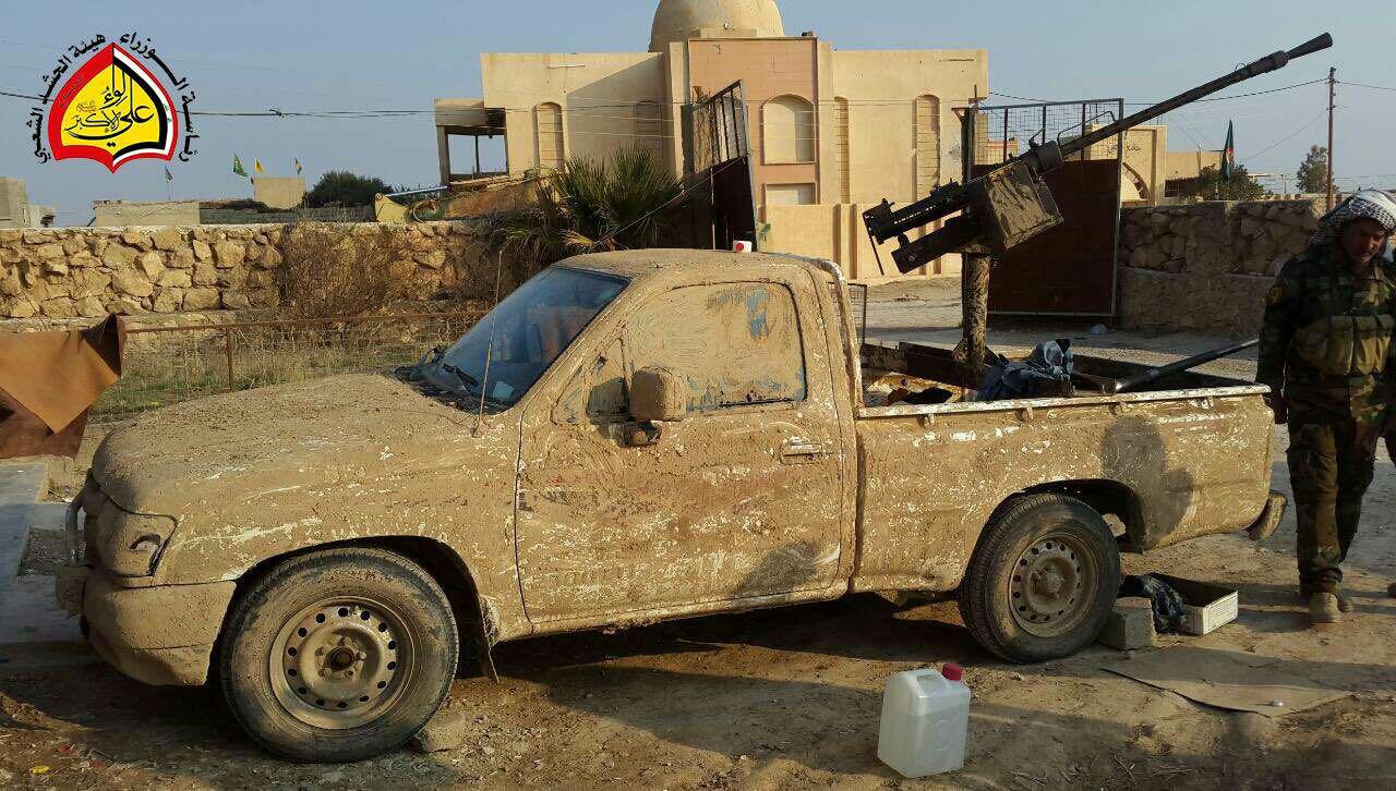 1_ مصدر ميداني : استولى مقاتلو لواء علي الأكبر (عليه السلام) التابع للعتبة الحسينية المقدسة على عجلة تحمل لوحة ارقام محافظة الأنبار ، و كانت العجلة تحمل سلاح احادية 14.5 فضلا عن مجموعة من اسلحة الرشاش وقناص مصنع يدوي عيار 23 تركها الدواعش وهربوا بعد التعرض الفاشل على قرية عين الحصان غرب الموصل مساء يوم امس.