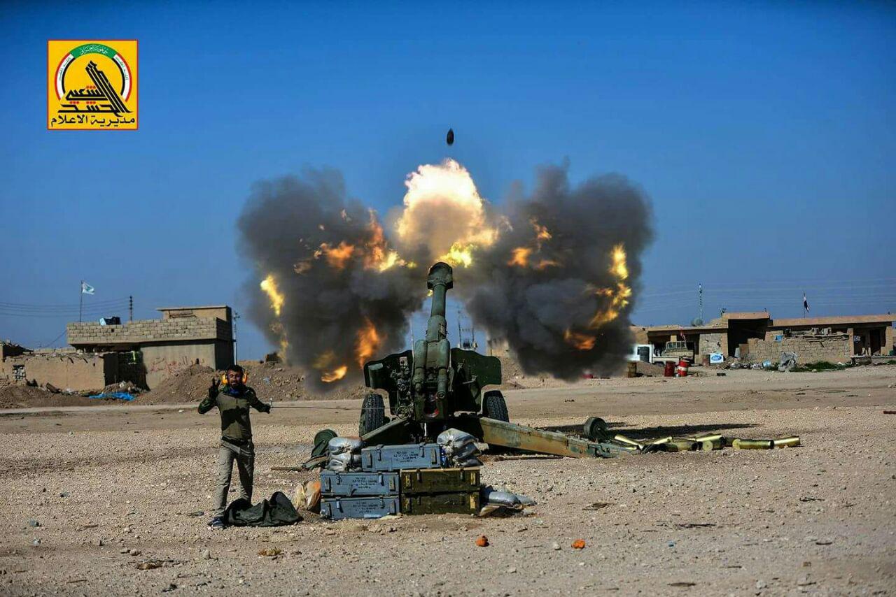 مدفعية الحشد الشعبي تقصف أهدافا منتخبة لتجمعات داعش في مناطق غرب الموصل.