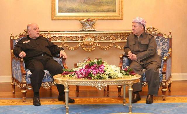 وقال مكتب العبادي في بيان إن الأخير "التقى في أربيل اليوم رئيس إقليم كردستان مسعود بارزاني"، مبينا أنه " خلال اللقاء مباركة الانتصارات المتحققة في الموصل وأهمية إدامة زخم هذه الانتصارات والتأكيد على تعزيز العمل بين المركز والإقليم".