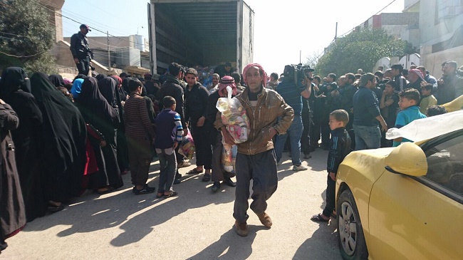 وتابع عضو لجنة الاغاثة حرصا منا على ارواح الناس الذين تجمعوا حول شاحنات المواد قررنا الانسحاب وإكمال التوزيع في مخيم الجدعة رقم 4 عند الساعة السادسة والنصف مساء.