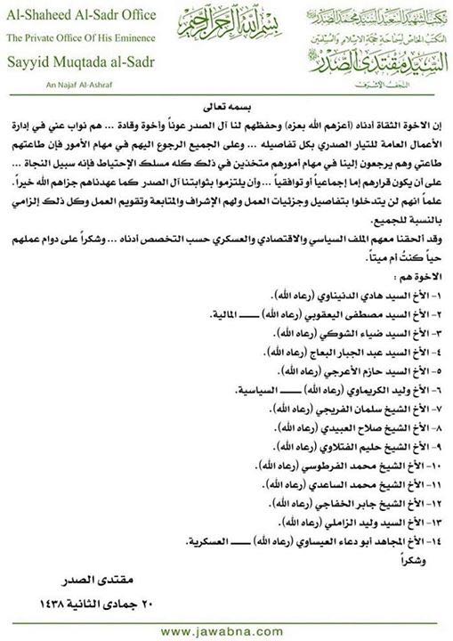 أوكل زعيم التيار الصدري، مقتدى الصدر، مهامه بإدارة التيار في جميع الشؤون الى عدد من مساعديه المقربين.