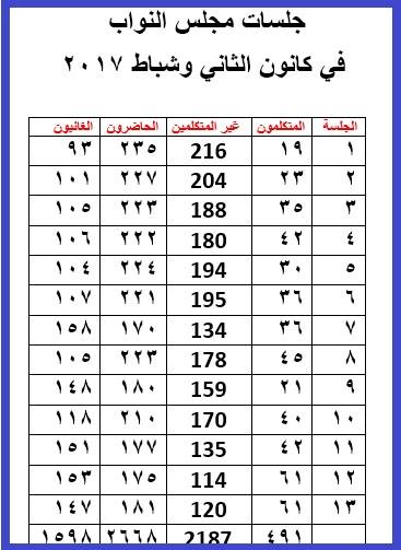 ومن خلال الاحصاءات لجلسات مجلس النواب خلال شهري كانون الثاني وشباط ظهرت ارقام مثيرة هي كما يلي: