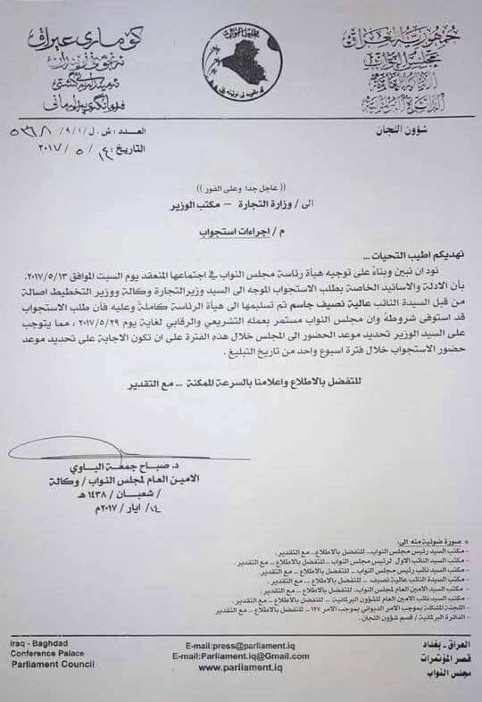 وجاء في كتاب رسمي صادر عن امين عام مجلس النواب وكالة صباح جمعة الباوي، وموجه الى مكتب وزير التجارة، إن "الادلة والاسانيد الخاصة بطلب الاستجواب الموجه الى الجميلي من قبل النائبة عالية نصيف تم تسليمها الى هيئة الرئاسة كاملة"، مبينا أن "طلب الاستجواب قد استوفى شروطه".