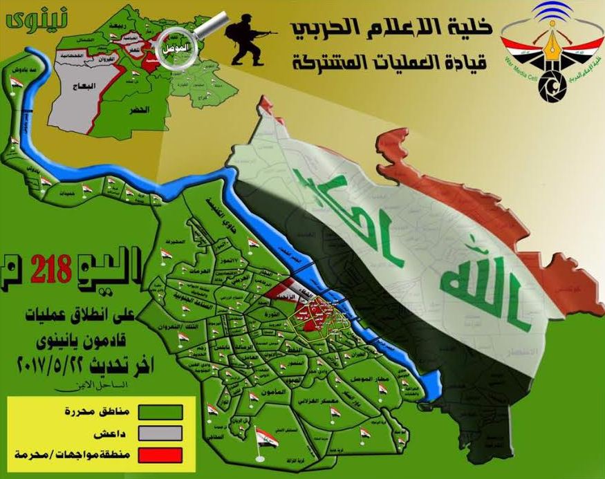 نشرت خلية الاعلام الحربي، اليوم الاثنين، خريطة مصورة لما تبقى من عمليات تحرير الساحل الايمن من مدينة الموصل.