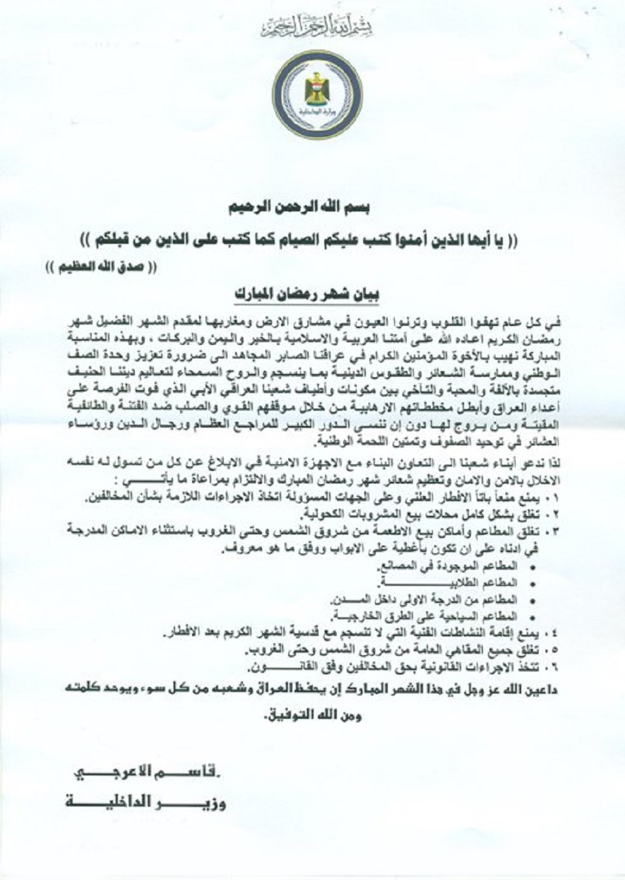 اصدرت وزارة الداخلية، الخميس، تعليمات خاصة للمواطنين واصحاب المطاعم بمناسبة شهر رمضان، وفيما منعت الافطار العلني، وجهت باغلاق محال المشروبات الكحولية.