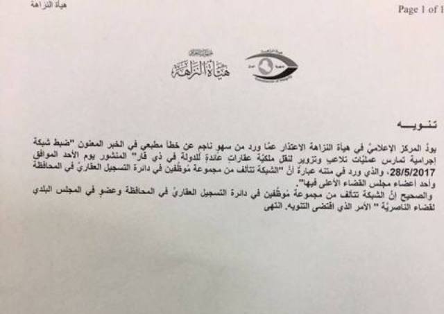 وجاء في كتاب رسمي صادر عن المركز الاعلامي لهيئة النزاهة، إن "المركز يود الاعتذار من سهو ناجم عن خطأ مطبعي في الخبر المعنون - ضبط شبكة اجرامية تمارس عمليات تلاعب وتزوير لنقل ملكية عقارات عائدة للدولة في ذي قار – المنشور يوم امس الاحد الموافق 28 ايار 2017"، مشيرا الى أن الخبر ورد في متنه عبارة أن "الشبكة تتألف من مجموعة موظفين في دائرة التسجيل العقاري في المحافظة وأحد اعضاء مجلس القضاء الاعلى فيها".