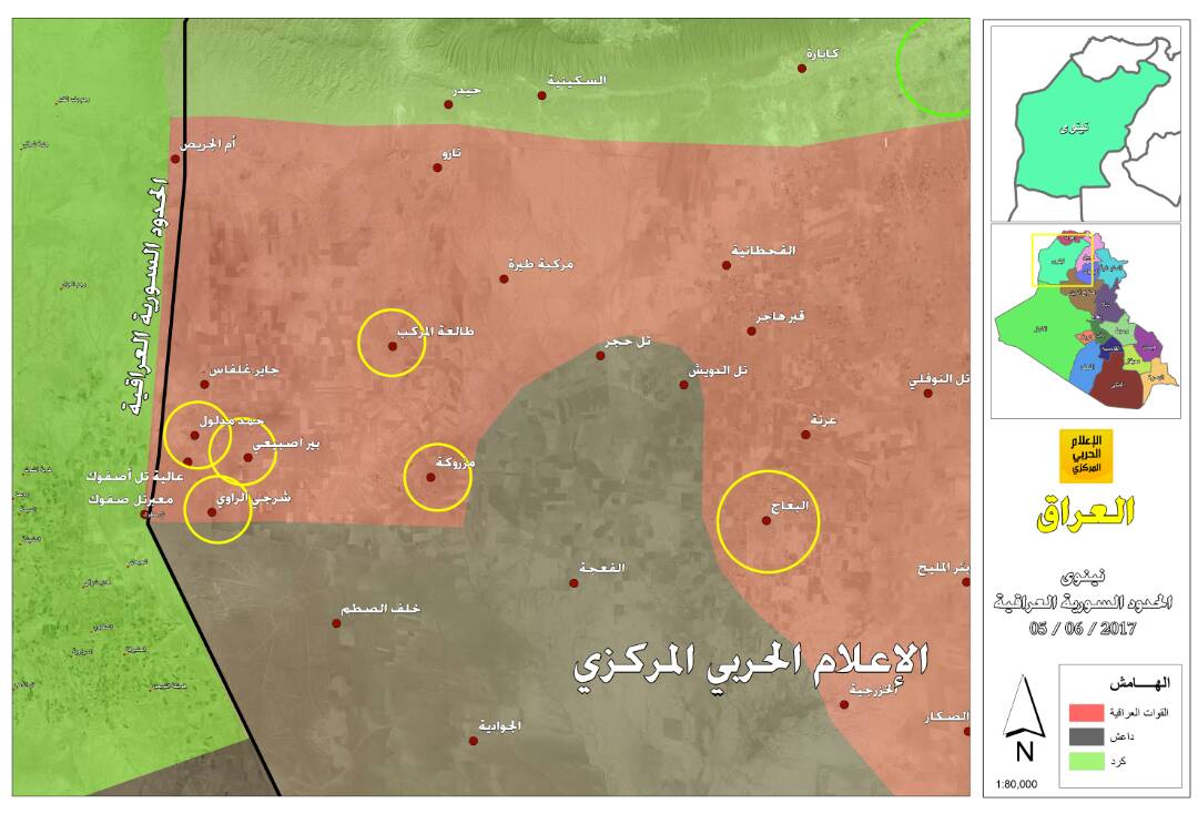 خريطة تظهر آخر تحديث للمناطق المحررة غرب البعاج على الحدود العراقية السورية
