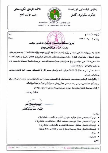وصدر قرارا من نائب الأمين العام للاتحاد الوطني الكردستاني، كوسرت رسول، اليوم الإثنين 12/6/2017، ، يفيد بإعفاء عضو قيادة الحزب، ورئيسة كتلة الاتحاد في البرلمان العراقي، آلا الطالباني، من منصبها.