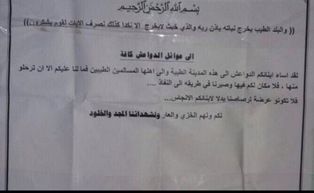 من جهة أخرى، قال مصدر أمني في نينوى إن "مجهولين وزعوا قصاصات على مساكن عوائل داعش تطالبها بمغادرة المحافظة خلال 48 ساعة والا سيتم القصاص منها".