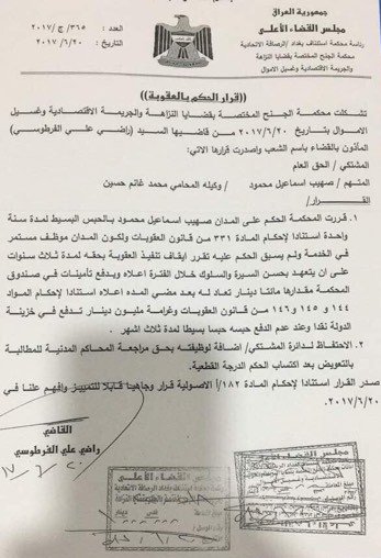 وقال فرحان في حديث صحفي ان "محكمة الجنح المختصة بقضايا النزاهة اصدرت اليوم، حكما لمدة سنة مع وقف التنفيذ على محافظ الانبار صهيب الراوي"، مبينا ان "الحكم على الراوي جاء على خلفية قضية سابقة".