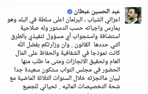 وذكر عبطان على صفحته في مواقع التواصل الاجتماعي [فيس بوك]، ان "البرلمان اعلى سلطة في البلد وهو يمارس واجباته حسب الدستور وله صلاحية استضافة واستجواب أي مسؤول تنفيذي بالطرق التي حددها القانون".