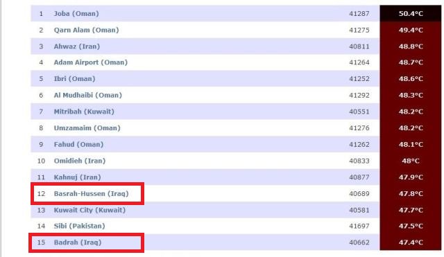 ونشرت محطة "بلاسيرفيلي" في كاليفورنيا الأمريكية، جدولا بأعلى درجات الحرارة في العالم خلال 24 ساعة الماضية، وبين الجدول أن منطقة الحسين بالبصرة احتلت المرتبة 12 بدرجة مئوية بلغت 47.8 درجة مئوية، فيما احتل قضاء بدرة بمحافظة واسط المرتبة 15 بدرجة حرارة بلغت 47.4 درجة مئوية.