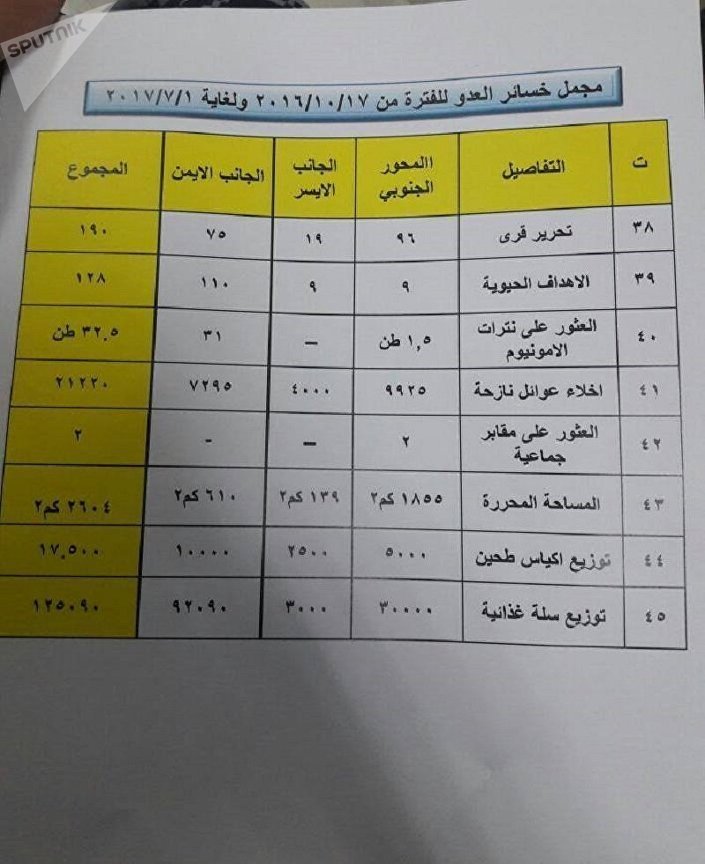 وتظهر الوثيقة أيضا ً مجمل خسائر تنظيم "داعش" على يد قوات الشرطة الاتحادية للفترة ما بين ساعة الصفر التي انطلقت بها عمليات تحرير الموصل، في 17 تشرين الأول/أكتوبر العام الماضي، وحتى الأول من تموز يوم أمس السبت.