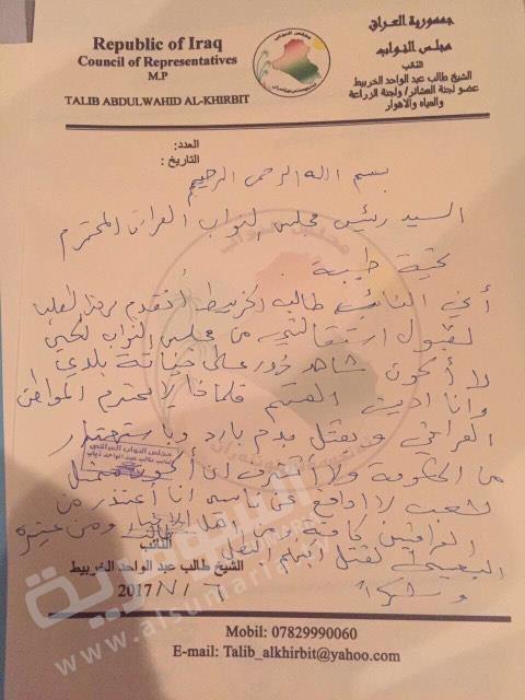 وذكر الخربيط في الطلب "اني النائب طالب الخربيط، اتقدم بهذا الطلب لقبول استقالتي من مجلس النواب، حتى لا اكون شاهد زور على خيانة بلدي".
