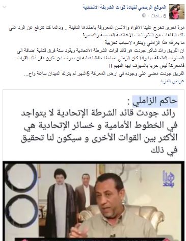 وتابع ان "الفريق جودت مضى على وجوده في ارض المعركة 5 اشهر لم يترك الميدان ساعة واحدة.. اما عن الشهداء ايها المتحذلق فانها دليل على ان الشرطة الاتحادية هي صاحبة النصر والتحرير فمن يقاتل في كل الجبهات ينزف الدماء".