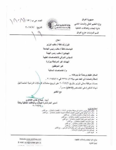 وقال مدير دائرة البعثات في الوزارة صلاح الفتلاوي في بيان إن "وزير التعليم العالي عبد الرزاق العيسى وافق على ترويج معاملات الزمالات الدراسية الخاصة لنيل شهادة الدكتوراه في اختصاص الإعلام حصرا".