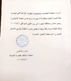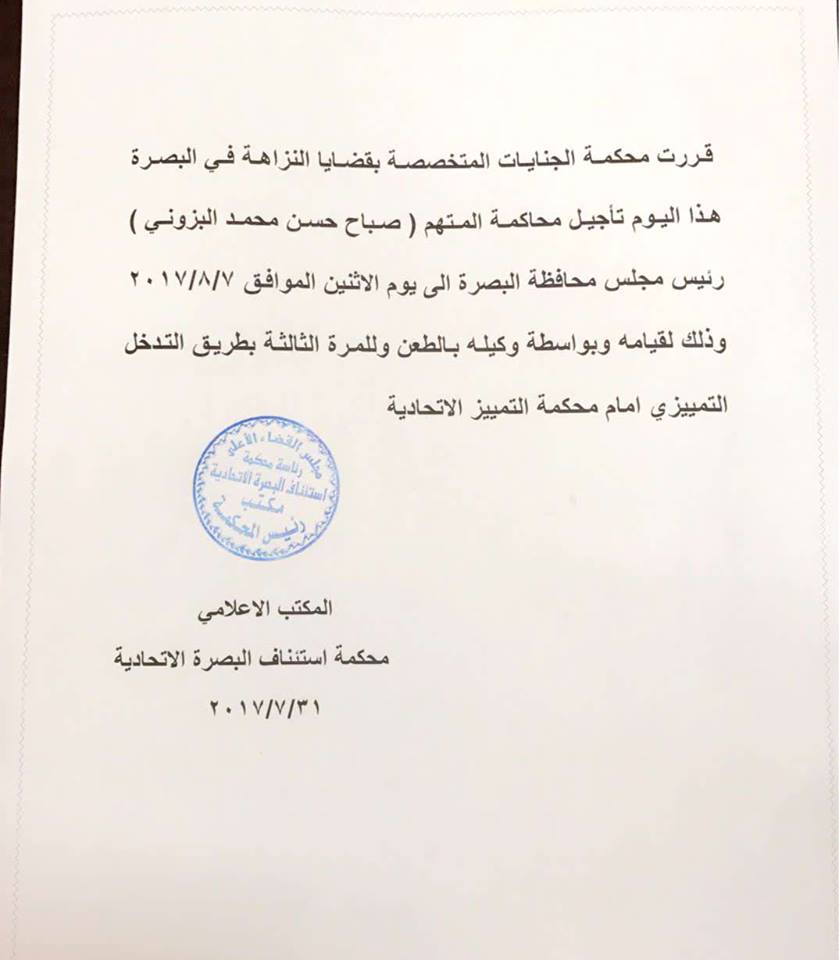 وتظهر وثيقة صادرة من المحكمة مفادها، أن "محكمة الجنايات المختصة بقضايا النزاهة في البصرة قررت، اليوم، تأجيل محاكمة المتهم صباح حسين محمد البزوني رئيس مجلس محافظة البصرة الى يوم الاثنين الموافق (7 آب 2017)".