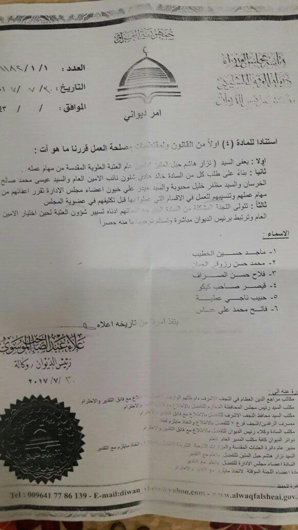 وبحسب وثيقة صادرة عن الموسوي، فقد تقرر تشكيل لجنة من ستة اشخاص بادارة شؤون العتبة لحين اختيار امينا جديدا لها.