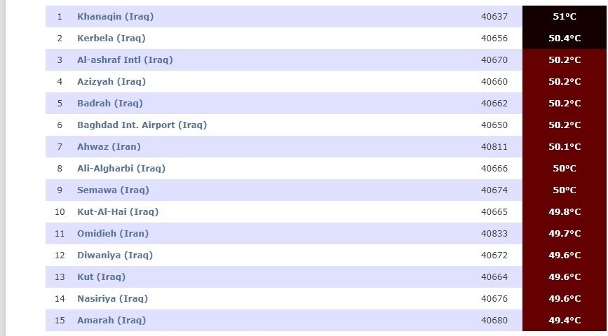 واحتل قضاء خانقين بمحافظة ديالى المرتبة الاولى باعلى درجات الحرارة بالعالم، حيث سجلت درجات الحرارة فيه 51 درجة مئوية، فيما احتلت محافظة كربلاء المرتبة الثانية في الجدول بدرجة حرارة تبلغ 50.4 درجة مئوية، تليها محافظة النجف الاشرف بدرجة حرارة بلغت 50.2 درجة مئوية .