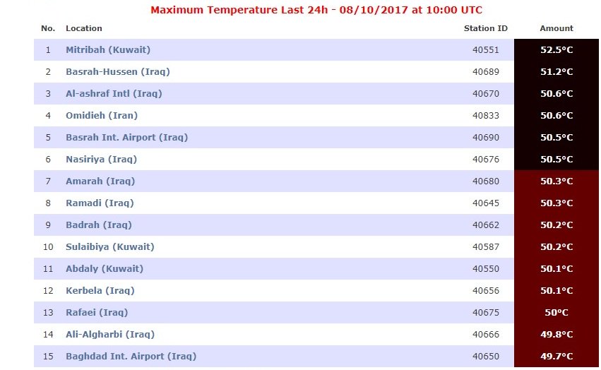 ويبين الجدول الاول ان منطقة الحسين بمحافظة البصرة احتلت المرتبة الثانية بالجدول باعلى درجات الحرارة بالعالم حيث سجلت درجات الحرارة فيها 51.2 درجة مئوية، تليها محافظة النجف الاشرف بدرجة حرارة تبلغ 50.6 درجة مئوية".