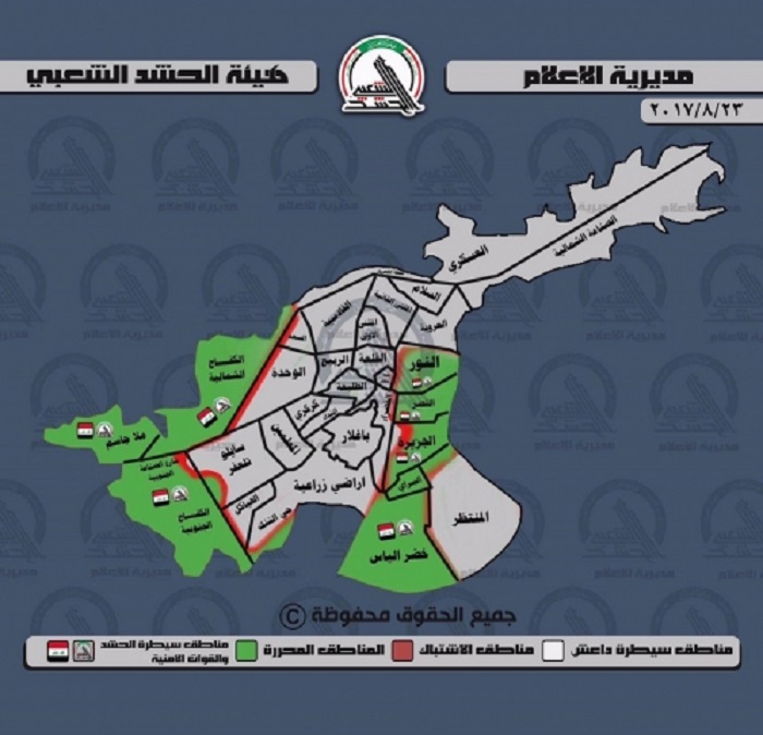 وأشار بيان لاعلام الحشد الى المواقع المحررة و المسيطر عليها وهي "أحياء التنك، والكفاح الشمالي، والكفاح الجنوبي، وقرية ويران، والعاشق الاولى، وحي العاشق الثانية، وتحرير ٣ قرى غرب المحلبية [شيخ ابراهيم - عين الواح - حمرة العرب]".