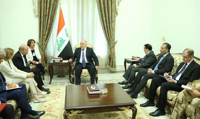 وقال المكتب الإعلامي لرئيس الوزراء في بيان إن "رئيس مجلس الوزراء حيدر العبادي استقبل، اليوم، وزير الخارجية الفرنسي جان ايف لودريان ووزير الدفاع الفرنسي فلورنس بارلي والوفد المرافق لهما، وجرى خلال اللقاء بحث تعزيز التعاون الثنائي بين البلدين في مختلف المجالات والحرب على داعش والانتصارات التي حققها العراق".