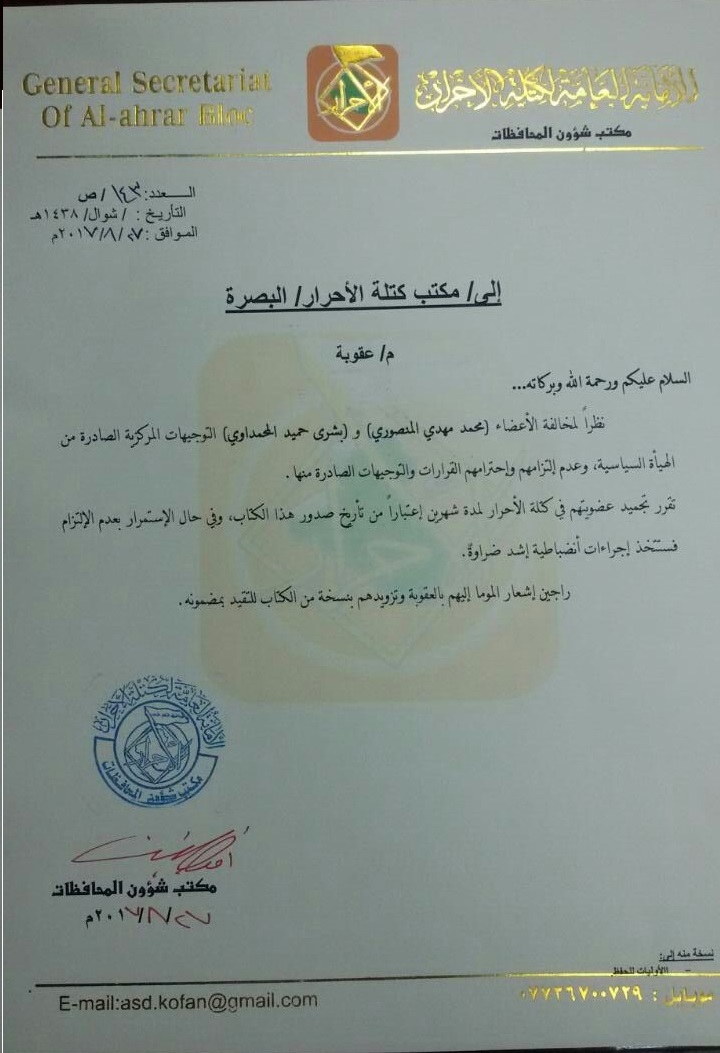 وذكر القرار الموجه الى مكتب الكتلة في البصرة، انه "نظرا لمخالفة الاعضاء (محمد مهدي المنصوري) و(بشرى حميد) التوجيهات المركزية الصادرة من الهيأة السياسية وعدم التزامهم واحترامهم القرارات الصادرة منها تقرر تجميد عضويتهم".