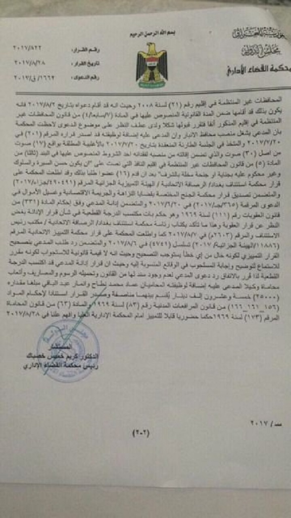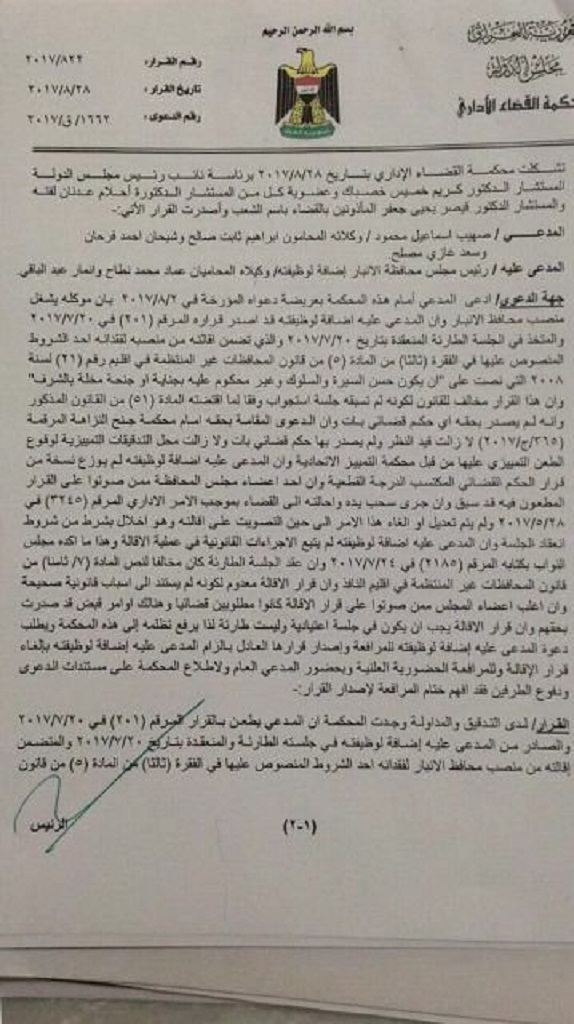 اصدرت محكمة القضاء الاداري، الاثنين، قرارا برد دعوى محافظ الانبار صهيب الراوي بشأن قرار اقالته من منصبه، فيما حملته كافة الرسوم والمصاريف واتعاب المحاماة.