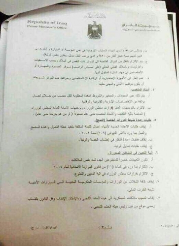 وجه رئيس مجلس الوزراء، القائد العام للقوات المسلحة، حيدر العبادي بكتاب رسمي وسري عدد من الضوابط والاجراءات الادارية التي تتعلق بنقل وتنسيب واعادة المنتسبين في الوزارات الامنية.